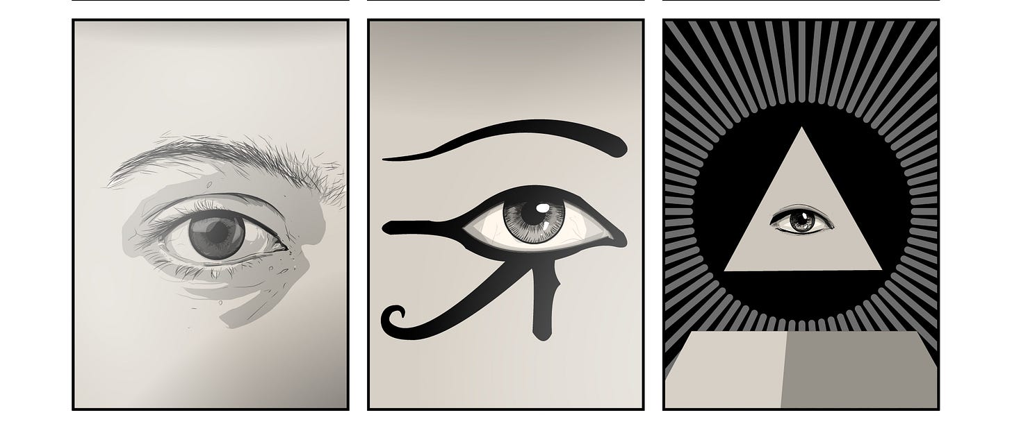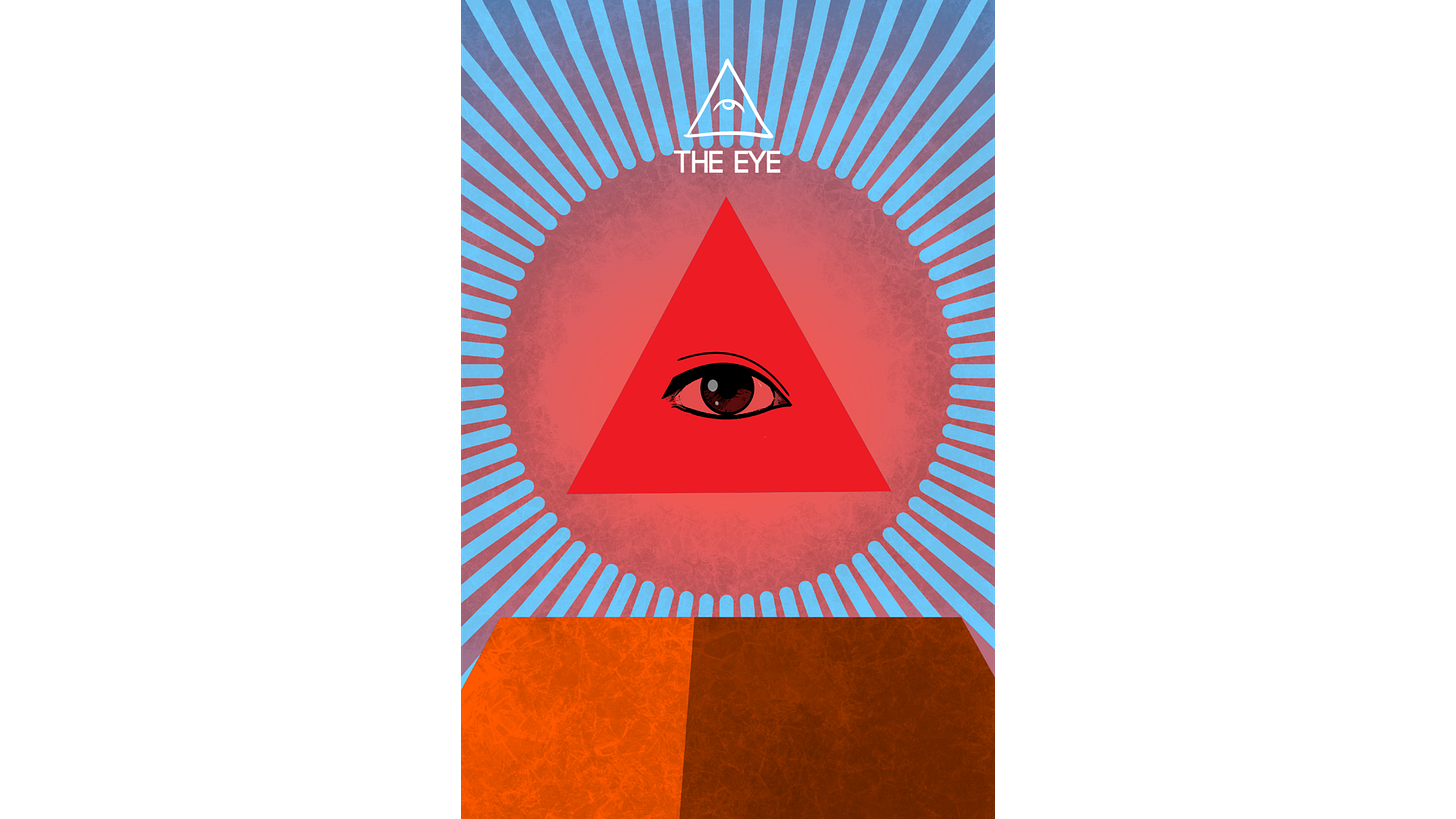 This symbology of the Eye of Providence (also known as the All-Seeing Eye) usually depicts a single eye enclosed within a triangle, often radiating rays of light or a glorious halo. I am reliably informed by the internet that its roots stretch back millennia, that it stretches back millennia to ancient Sumerian sculptures that used enlarged eyes to emphasise holy vigilance, and to the ancient Egyptian Eye of Horus, which symbolised protection, healing, and restoration.